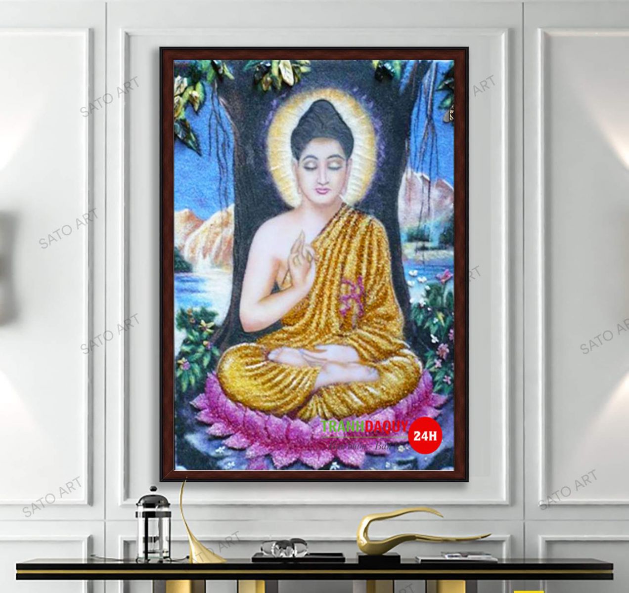 Tranh đá quý 24h xin được gửi đến quý khách hàng về ý nghĩa và giá trị phong thuỷ của mẫu tranh đá quý chân dung phật tổ. Đây là mẫu tranh rất phù hợp để treo trong gia đình hoặc môi trường cơ quan đoàn thể. Chúng sẽ mang đến cho gia chủ nhiều tài lộc, may mắn, thành công và trường thọ.
